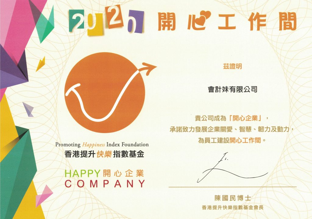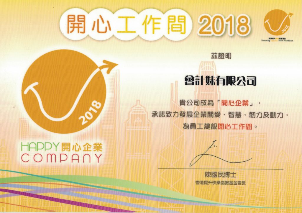 會計妹®為提升員工工作快樂水平,參加了由香港提升快樂指數基金及生產力促進局合辦的「開心工作間」推廣計劃,承諾為員工締造愉快的工作環境,並獲頒發「開心企業2018」 標誌!