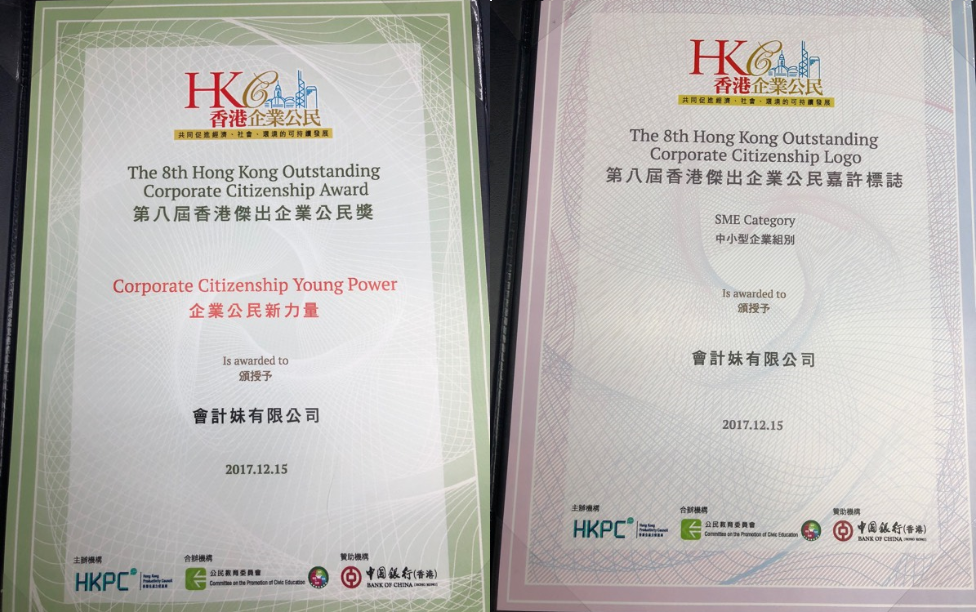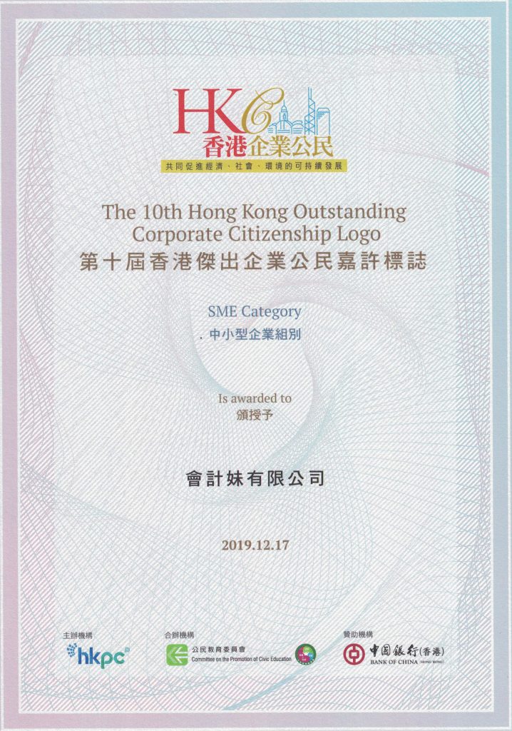 由香港生產力促進局(生產力局)主辦,公民教育委員會合辦,中國銀行(香港)贊助的「香港企業公民計劃」設立「香港企業公民嘉許計劃」(嘉許計劃),以表揚積極履行社會責任的企業與機構。會計妹®很開心獲香港生產力促進局嘉許,作為香港公民之一,會計妹®定當繼續盡心盡力履行社會責任,努力為香港市民服務!
