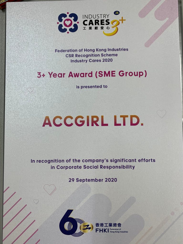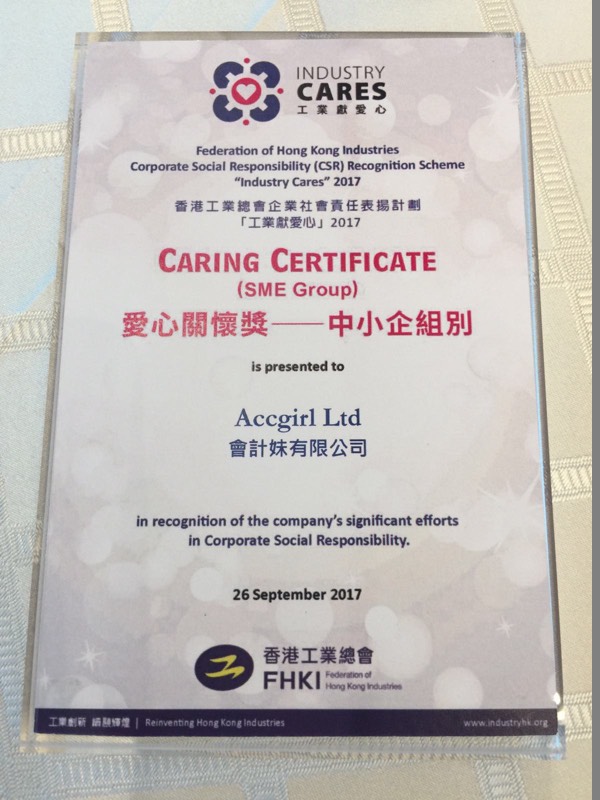 會計妹榮獲由香港工業總會主辦 「工業獻愛心2017」嘉許計劃之「愛心關懷獎」名銜,以表揚公司在企業社會責任方面所作出之貢獻!